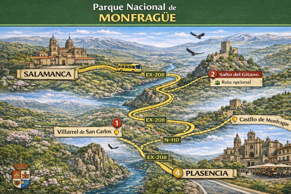 El Parque Nacional de Monfragüe es uno de los espacios naturales más valiosos de España, conocido por sus paisajes de dehesa, sus cortados rocosos, sus ríos y su extraordinaria riqueza en fauna, especialmente aves: buitre leonado, buitre negro, aguila imperial ibérica, cigüeña negra, alimoche y búho real.