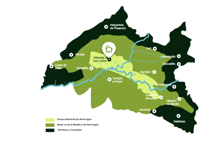 Es el único núcleo de población que se encuentra dentro del Parque Nacional, lo que lo convierte en el centro neurálgico de la zona más conocida y visitada de la Reserva de la Biosfera de Monfragüe.